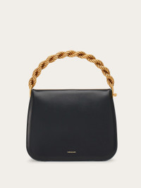 Lady-like allure and a retro vibe define this new handbag from Ferragamo. The semi-rigid structure features vegetable-tanned calfskin panels and accordion details with a semi-matte finish. Geometric and rounded on the base, it opens via a vintage-inspired side lever and snap lock mechanism. The golden-finish metal frame on the interior reveals a lined compartment complemented by four flat pockets. The bejeweled handle with double-strand twisted detailing adds an elegant edge, thanks to the special antique gold finish. - height 18.0 CM / 7 IN length 22.5 CM / 8.8 IN width 9.0 CM / 3.5 IN - Composition: calfskin - Product code: 215923 767209 - Made in ITALY