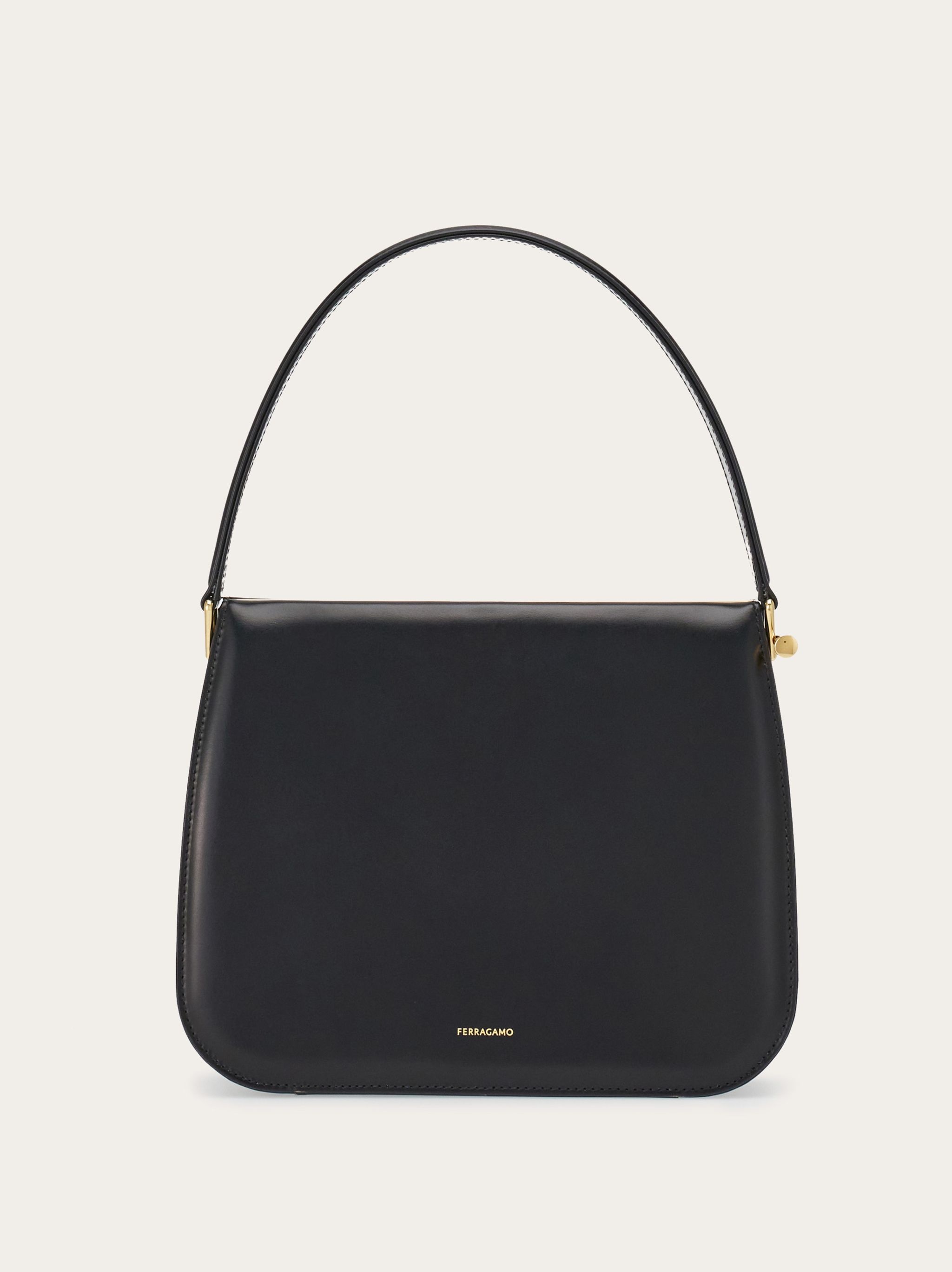 Lady-like allure and a retro vibe define this new handbag from Ferragamo. The semi-rigid structure features vegetable-tanned calfskin panels and accordion details with a semi-matte finish. Geometric and rounded on the base, it opens via a vintage-inspired side lever and snap lock mechanism. The golden-finish metal frame on the interior reveals a lined interior complemented by four flat pockets. - height 18.0 CM / 7 IN length 22.5 CM / 8.8 IN width 9.0 CM / 3.5 IN - Composition: calfskin - Product code: 215485 766718 - Made in ITALY