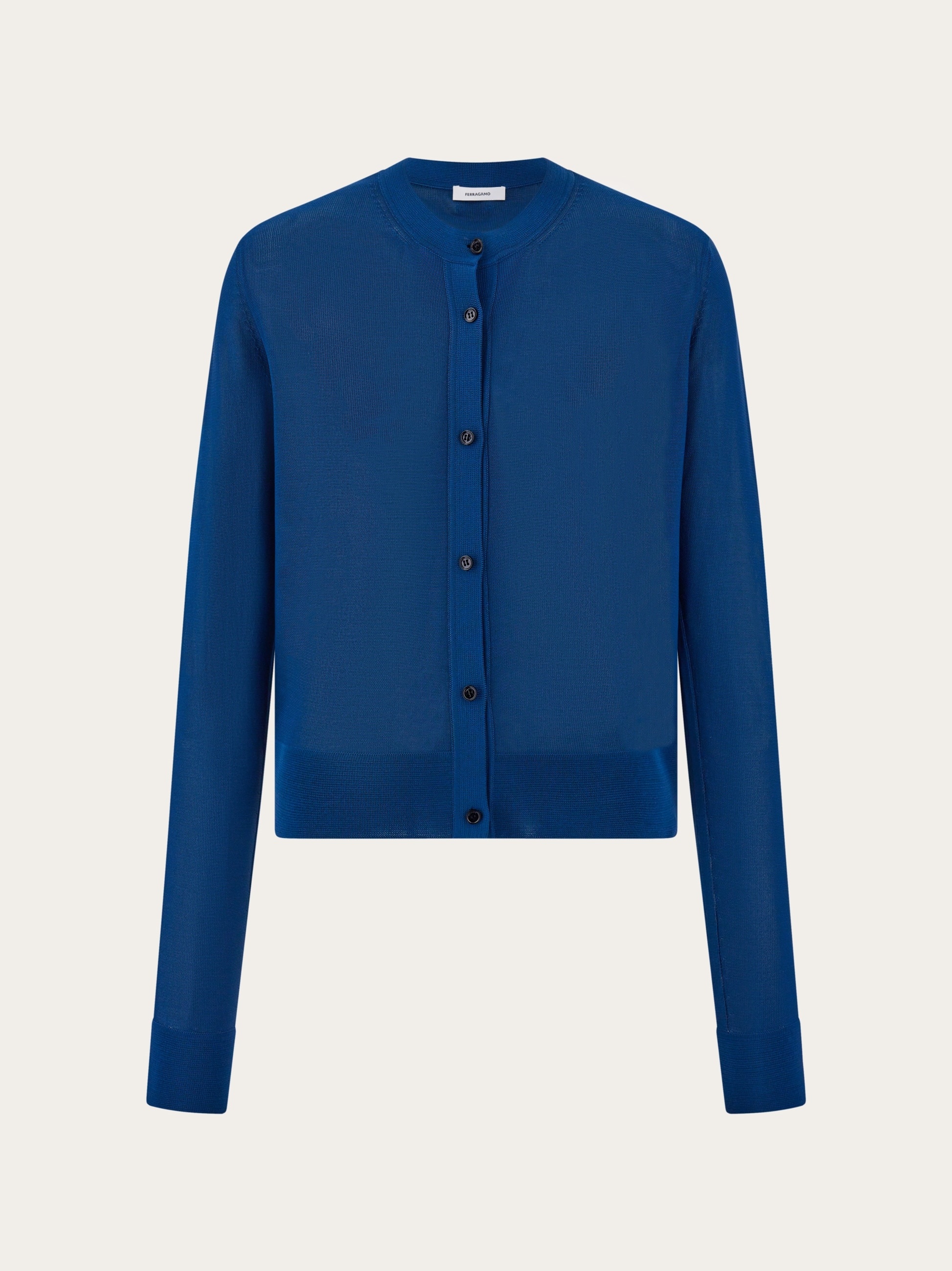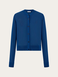 Classic shapes in a current key: this pure viscose cardigan defines a contemporary femininity that sets the Brand apart. The semi-transparent finish is balanced by the clean cut silhouette, with classic round neckline and ribbed trims. A custom metal tab is placed at the back of the neck. - Composition: 100% viscose - Model measurements: Height 5' 10"/178 cm cm; Bust 30½"/78 cm; Waist 23"/59 cm; Hips 35"/89 cm - Model wearing: XS - Made in ITALY - Product code: 112972 780776