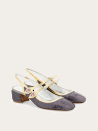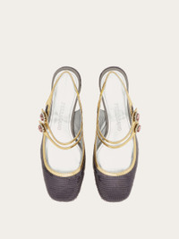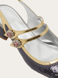 Wet look sequins give this new Ferragamo slingback a twist of directional glamour. A blend of contemporary and classic details, it is set on a covered block heel with a curved outline. Cabochon crystals are placed on the 'buttonholes' of the golden straps, and golden leather trims complete the design. - Composition: fabric and sequins - Made in ITALY - Product code: 01K856 787876