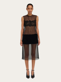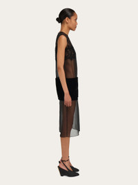 Contemporary elegance with a bold twist. Mid-length transparent chiffon sets the tone for this sensual sleeveless dress with high fashion details. Inlays of Italian lace and stretch merino shearling are strategically placed across the bust and hips for a new take on evening wear that is bold and extremely feminine. The low waist evokes a 1920’s aesthetic, the inspiration behind this season’s collection. - Composition: 100% silk - Made in ITALY - Product code: 13H659 788249