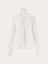 Classy, elegant, and somewhat ethereal, this Ferragamo shirt is cut from pure organic silk. The fabric features a tonal Gancini motif, and the collar is made up of two long sashes that cross over at the neck to create the keyhole neckline that leads to a button up placket. A yoke across the back of the shoulders adds a masculine note. High button cuffs and straight hem. - Composition: 100% organic silk - Made in ITALY - Product code: 13C797 776455