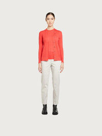 Pure virgin wool sweater knitted with a mini “a jour” stitch featuring the Gancini outline for an eye catching texture and refined look. The slim fit and minimal outline make it perfect for the transitional seasons, an easy piece that is sure to become a staple. Wear with the matching cardigan for a sophisticated twin set. Made using wool derived from responsible sources with high standards of animal welfare and land stewardship. Model measurements: Height 5' 9½"/176 cm; Bust 31½"/80 cm; Waist 25"/63 cm cm; Hips 35½"/90 cm - Composition: 100% pure virgin wool - Made In ITALY