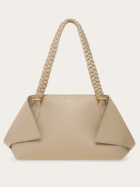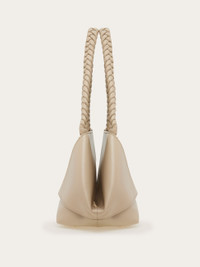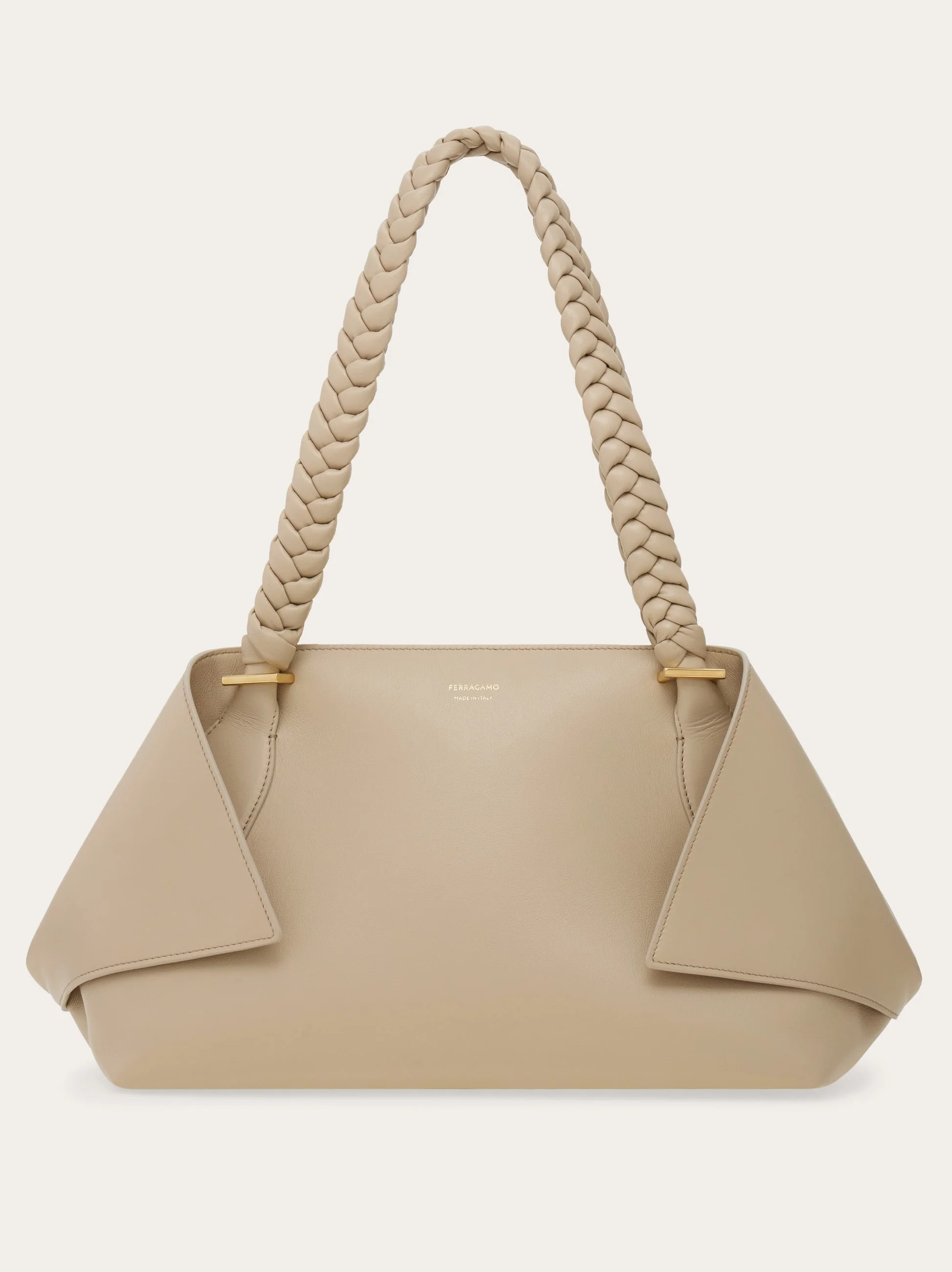 Ferragamo introduce a brand new silhouette: the Scarf bag. With its natural sophistication, the smooth calfskin leather billows at the sides like soft fabric, while the braided, mid-length top handle echoes the Brand’s artisanal flair. A double slider zip opens to reveal a spacious lined interior with zip pocket, and custom metal studs protect the base. - A) Height 9.4 IN B) Length 17.7 IN C) Width 7.4 IN - Composition: calfskin - Large - Made in ITALY - Product code: 219871 781043