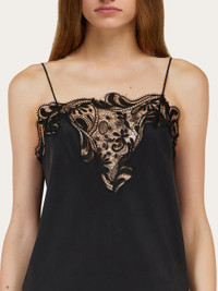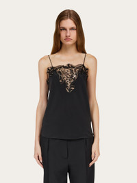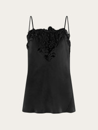 Lingerie-inspired pure silk vest with ultra-slim spaghetti straps and a deep V-neck. The macrame lace embellishment adds a sophisticated twist to this top that works beautifully under a collection cardigan or blazer. - Composition: 100% silk - Made in ITALY - Product code: 13H335 785267