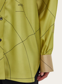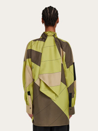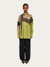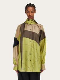 Sophisticated evolution of the silk shirt, decorated with the parachute pattern in this season’s dusty hues. The cut, with drop shoulder and kimono sleeves, is accompanied by a sash that ties at the neck; a style that can worn in different ways. - Composition: 100% silk - Made in ITALY - Product code: 13H171 784130