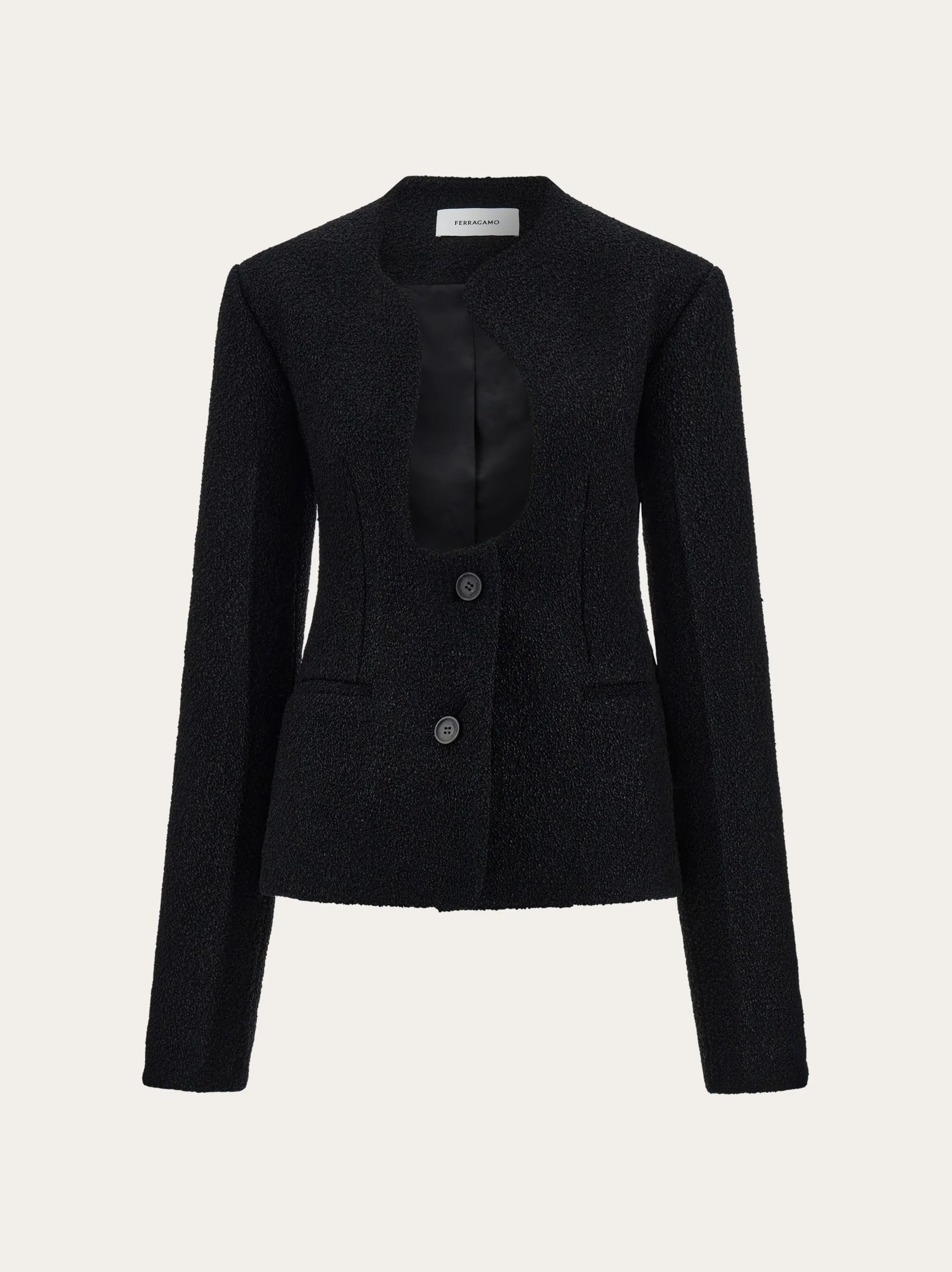 A savvy cocktail of edgy silhouettes and expertly engineered fabrics, this single breasted blazer speaks the language of contemporary femininity. Made of lightweight boucle, it has a single breasted cut with horn buttons and signature diagonal buttonholes. Detailed with a sculptural neckline, this striking cover up comes with matching shorts. - Composition: 68% viscose, 32% polyamide - Model measurements: Height 5' 10"/178 cm; Bust 31½ "/80 cm; Waist 23½"/60 cm; Hips 34 "/88 cm - Model wearing: 38 - Made in ITALY - Product code: 13G796 782706