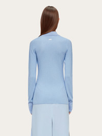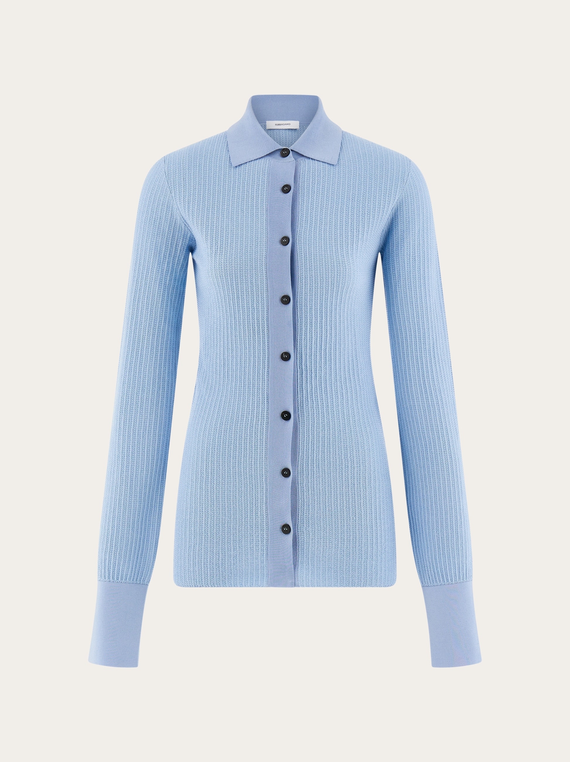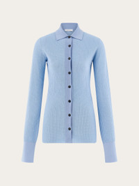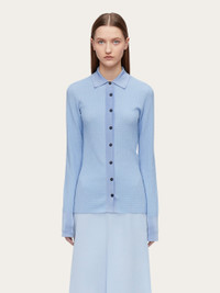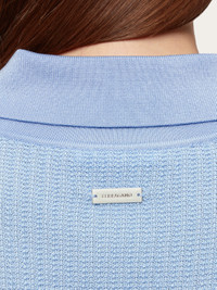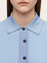 A fine blend of viscose, cotton and silk is used to create this shirt style cardigan. The body is woven in a micro jacquard with contrasting fine rib knitted collar, placket, and high cuffs. Custom buttons fasten along the front, and a custom metal tab is placed at the back of the neck. Pair it with the matching tank top for a contemporary preppy look. - Composition: 41% viscose, 31% silk, 26% cotton, 1% polyamide, 1% elastane - Made in ITALY - Product code: 112786 775943