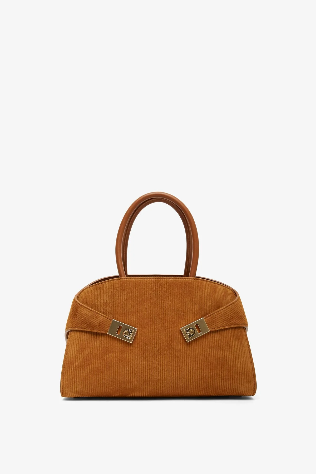 Light brown suede tophandle bag from Ferragamo. The Hug S tophandle bag is made from ribbed-suede, featuring an asymmetrical back panel that wraps around to "hug" the front via two wide straps with gold-toned Gancini clasps. It fastens on the inside with a metallic ring, the lined interior features a zip pocket, and a tonal leather fob is placed on the rigid top handle. It is complete with gold-toned studs at the base. - Measurements: L31.5 x H22 x W19 cm - Made in Italy Product Code: 785775