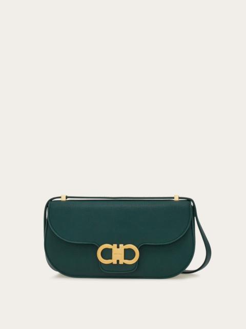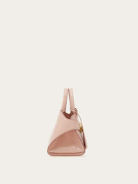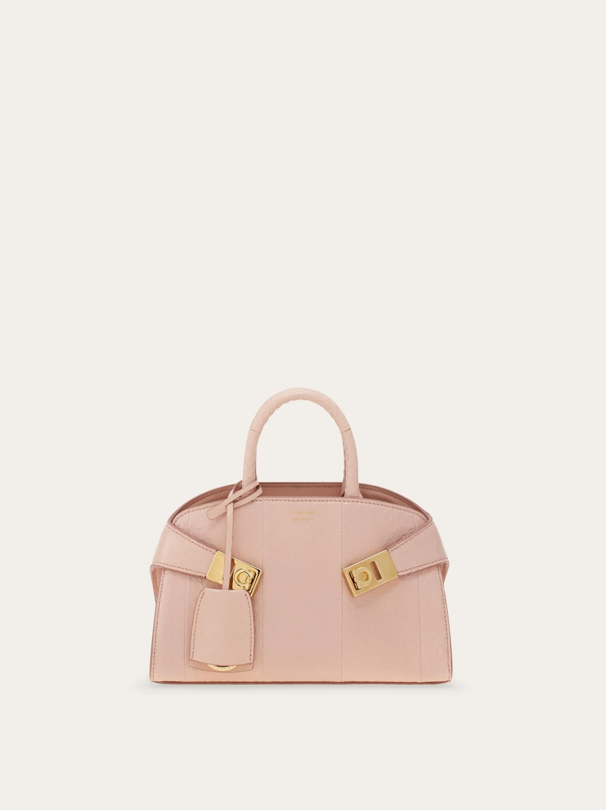 Compact and luxurious, the dials of this precious iteration of the Ferragamo Hug bag are cut from precious elaphe leather. With an asymmetric back panel whose wide straps wrap the rounded side bellows, this unique silhouette features golden clasps at the front. It is fastened with a ring on the inside, and has a removable shoulder strap. A covered key ring hangs playfully from the top handle. - A) Height 5.5 IN B) Length 8.8 IN C) Width 4.3 IN - Composition: elaphe - Handle drop: 2.9 in/7,5 cm - Extra Small - Made in ITALY - Product code: 219442 784693