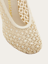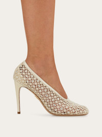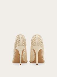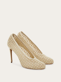 Ferragamo craftsmanship is on full display in this macrame stiletto shoe. The woven upper is embellished with tiny micro crystals all over and the patent leather covered heel and tonal trim add a touch of contemporary grit to this archive inspired work of wearable art. - Composition: fabric - Made in ITALY - Product code: 01K625 789978