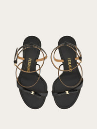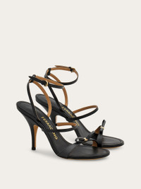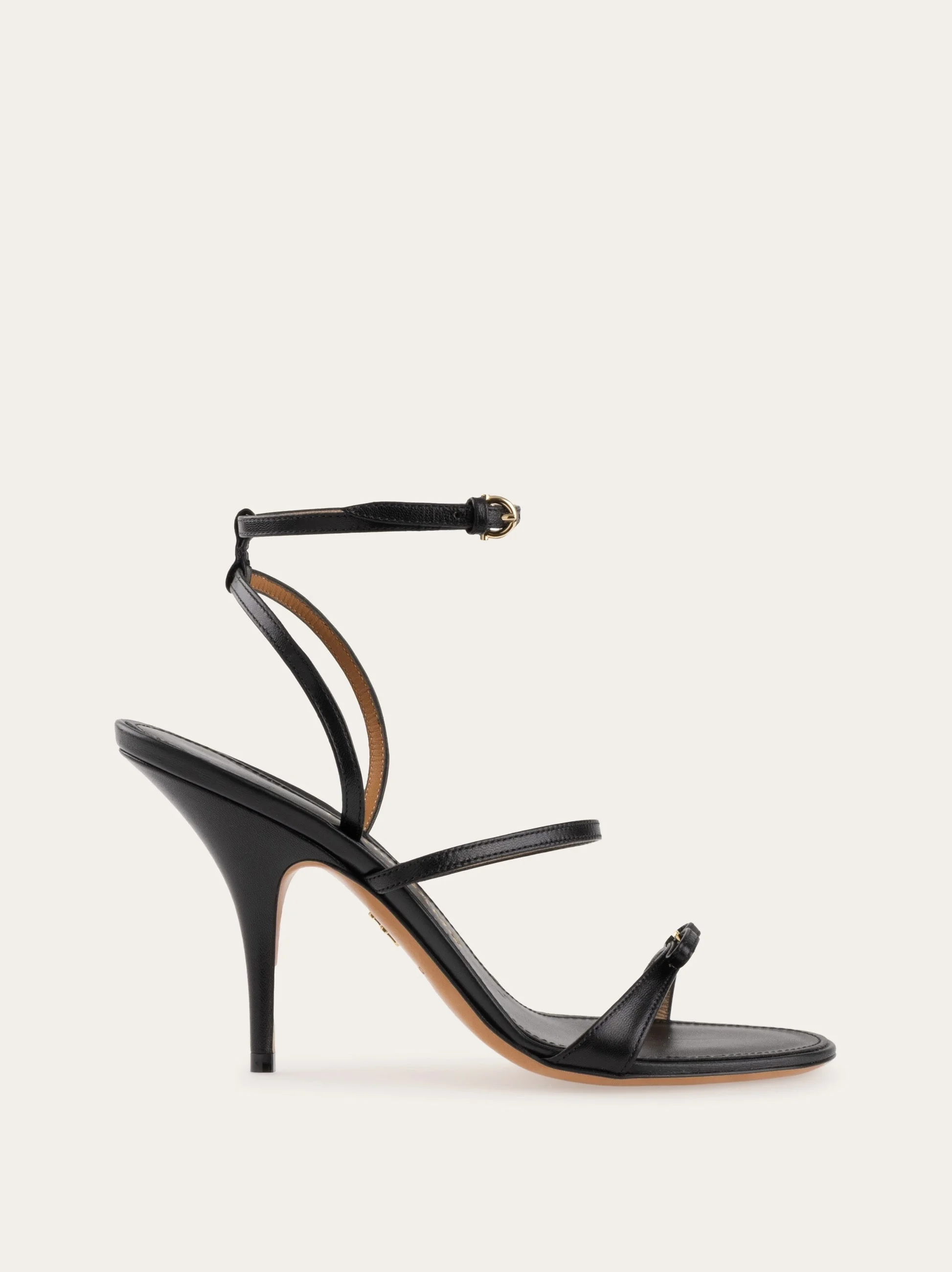 Extremely elegant with a sensual twist; the new Ferragamo sandal speaks the language of modern minimalism. The slim calfskin straps that delicately wrap the foot are graced with a dainty bow held by a custom buckle at the tip, and fastened by a mini Gancio buckle at the ankle. - Composition: kid leather - Heel 9.5 cm - Made in ITALY - Product code: 01K044 784149