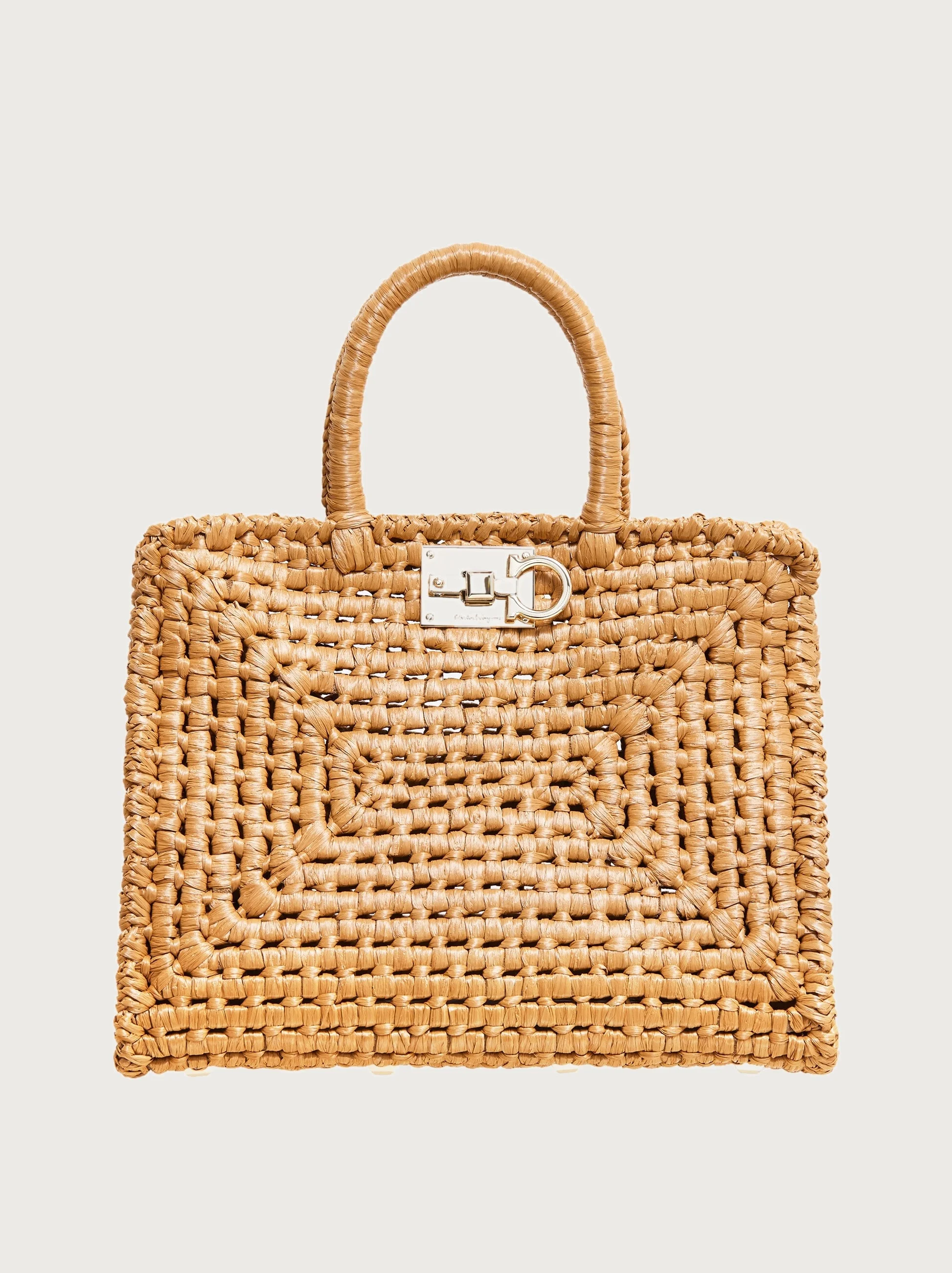 Compact and casual summer interpretation of the Ferragamo Studio bag. The sophisticated hand woven multicolored raffia-effect fabric, creates an elegant geometric design, which is inspired by the Sicilian coffa bag. The details echo the original design: closure with Gancini detail, canvas lining with removable internal clutch. Square metal feet studs for a recognizable look of excellence and class. - A) Height 9.4 IN B) Length 11.4 IN C) Width 5.7 IN - Composition: raffia-effect fabric - Medium - Made in ITALY - Product code: 21I101 760360
