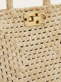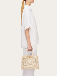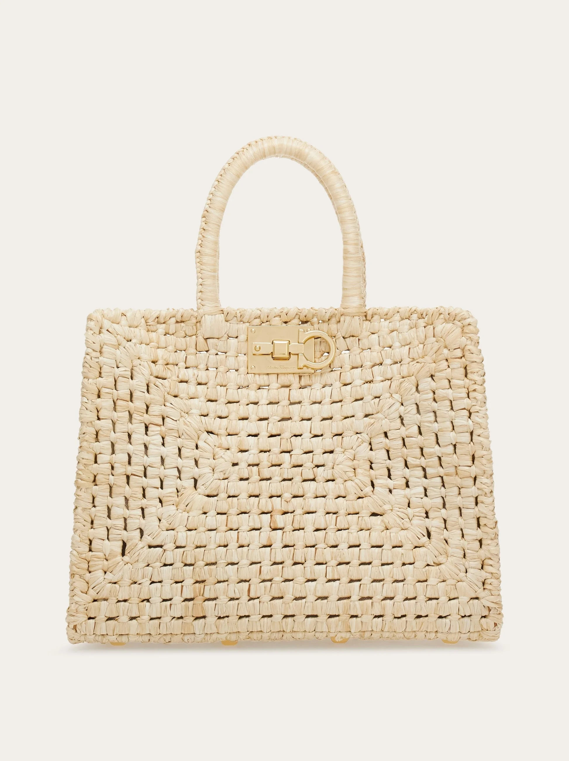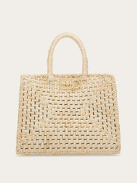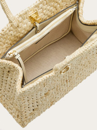 The summery take on our Ferragamo Studio Box bag with a colorful raffia-effect fabric structure that has been hand woven. The details have been inspired by the original model, with Gancini slider fastening, canvas lining and detachable inner clutch. Custom metal feet studs. - A) Height 9.4 IN B) Length 11.4 IN C) Width 5.7 IN - Composition: raffia-effect fabric - Medium - Made in ITALY - Product code: 21I101 763427