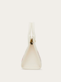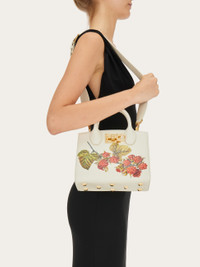 An iconic silhouette with contemporary lines and innate elegance: A colorful twist on the Ferragamo Studio Box bag. This compact version is a wonderful display of the rich material – soft calf leather with a natural grain – with a bright and colorful pattern inspired by heritage foulard prints. The construction is faithful to the beloved icon, with a Gancini slider clasp in an antique golden finish that echoes the metallic golden hue on the foot studs. A lined interior is complete with flat pockets for perfect organization of your personal effects. Practical elements include padded handles and removable shoulder strap. - height 7.4 IN length 8.6 IN width 4.5 IN - Composition: calfskin - Made in ITALY - Product code: 211496 769955