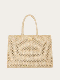 The summery take on our Ferragamo Studio Box bag with a colorful raffia structure that has been hand woven. The details have been inspired by the original model, with Gancini slider fastening, canvas lining and detachable inner clutch. Custom metal feet studs. - height 43.0 CM / 16.9 IN length 31.0 CM / 12.2 IN width 17.0 CM / 6.6 IN - Composition: calfskin and raffia - Product code: 214458 763431 - Made in ITALY