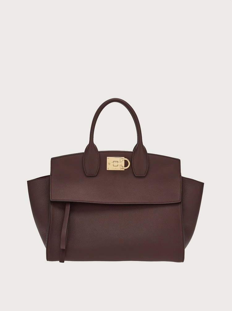 A contemporary favorite, the Ferragamo Studio Bag, is reinterpreted with a deconstructed shape for a new concept day bag. Made of hammered calf leather with a soft and rich feel, tested and verified to have been produced using a metal-free tanning process, this capacious accessory is light and unlined for a casual feel, perfect for commuting to work or days off in the city. The construction is faithful to the original, with a large front pocket closed by a long leather zip puller, rounded front flap, removable pouch, and distinctive metal feet studs. The golden Gancini slider clasp is the perfect finishing touch. Zipper tape is made using 90% recycled polyester and sewing thread is made from 100% post-consumer recycled polyester. - Composition: calf leather - Made In ITALY