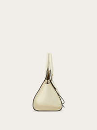 The cool and compact version of the Ferragamo Studio Soft bag featuring hammered leather panels in the collection’s new color palette. The deconstructed construction is unlined with the iconic Gancini slider fastening and zipped front pocket. The custom foot studs and jacquard tape shoulder strap complement the design. The upper is made from leather tested and verified to have been produced using a metal-free tanning process, zipper tape is made using 90% recycled polyester and sewing thread is made from 100% post-consumer recycled polyester. - A) Height 9.8 IN B) Length 11.4 IN C) Width 5.5 IN - Composition: hammered calfskin - Handle drop: 3.9 in/10 cm - Medium - Made in ITALY - Product code: 214493 763097