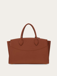 A new edition to the Ferragamo Studio line, the Soft bag, cut from rich Italian calfskin. The dappled texture of the hammered leather echoes the sumptuous feel of this capacious accessory with ample slide bellows and tonal top handle. It fastens via a golden Gancio slider clasp, with tonal covered keyring for a playful note. Custom studs protect the base. Adjustable removable shoulder strap. - A) Height 9.4 IN B) Length 14.1 IN C) Width 6.4 IN - Composition: hammered calfskin - Handle drop: 4.7 in/12 cm - Large - Made in ITALY - Product code: 21A110 785997