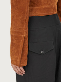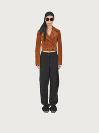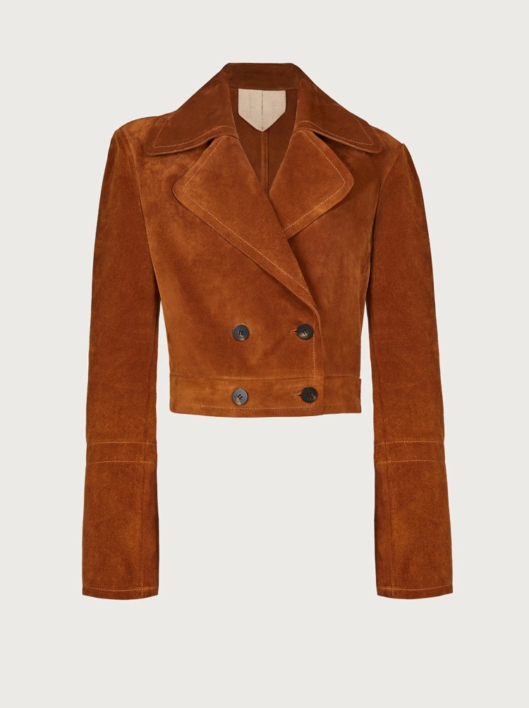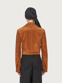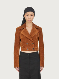 A wardrobe must have with a contemporary twist and an artisanal hand. The Ferragamo skill is on full display is this soft, Italian suede jacket. Casual with tailoring details, it has a large collar and lapel and a double breasted button up fastening. The cropped length confirms a contemporary feel, perfect with high waisted trousers for a refined, easy look. Model measurements: Height 5' 11"/180 cm; Bust 31½"/79.5 cm; Waist 23½"/60 cm, Hips 34½"/87 cm - Composition: calf suede - Made In ITALY