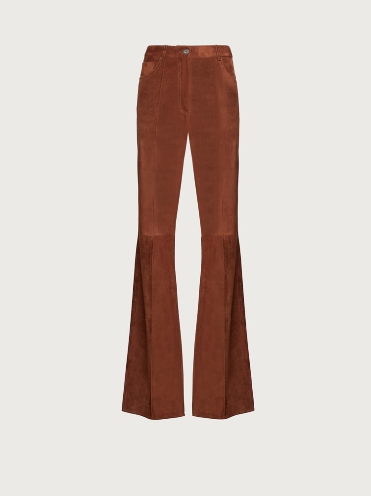 A high-end take on the classic five pocket trouser, cut from the softest, Italian lamb suede. The flared leg and the ribbed front echo a 70’s feel, complemented by the iconic stitched pockets on the front and applied pockets on the back. Patch with a raised Gancio pattern on the back for a custom finish. - Composition: lamb suede - Made In ITALY
