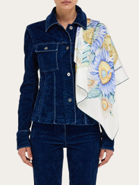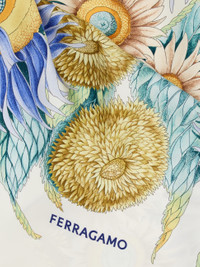 Inspired by a heritage motif and reimagined with up-to-date shades and details, this pure silk twill scarf is decorated with a luxurious bouquet of sunflowers. A symbol of joy, positivity, strength and loyalty, the sunflower is one of the motifs favored by Salvatore Ferragamo in his compositions. - length 35.4 IN width 35.4 IN - Composition: 100% silk - Made in ITALY - Product code: 310196 780054