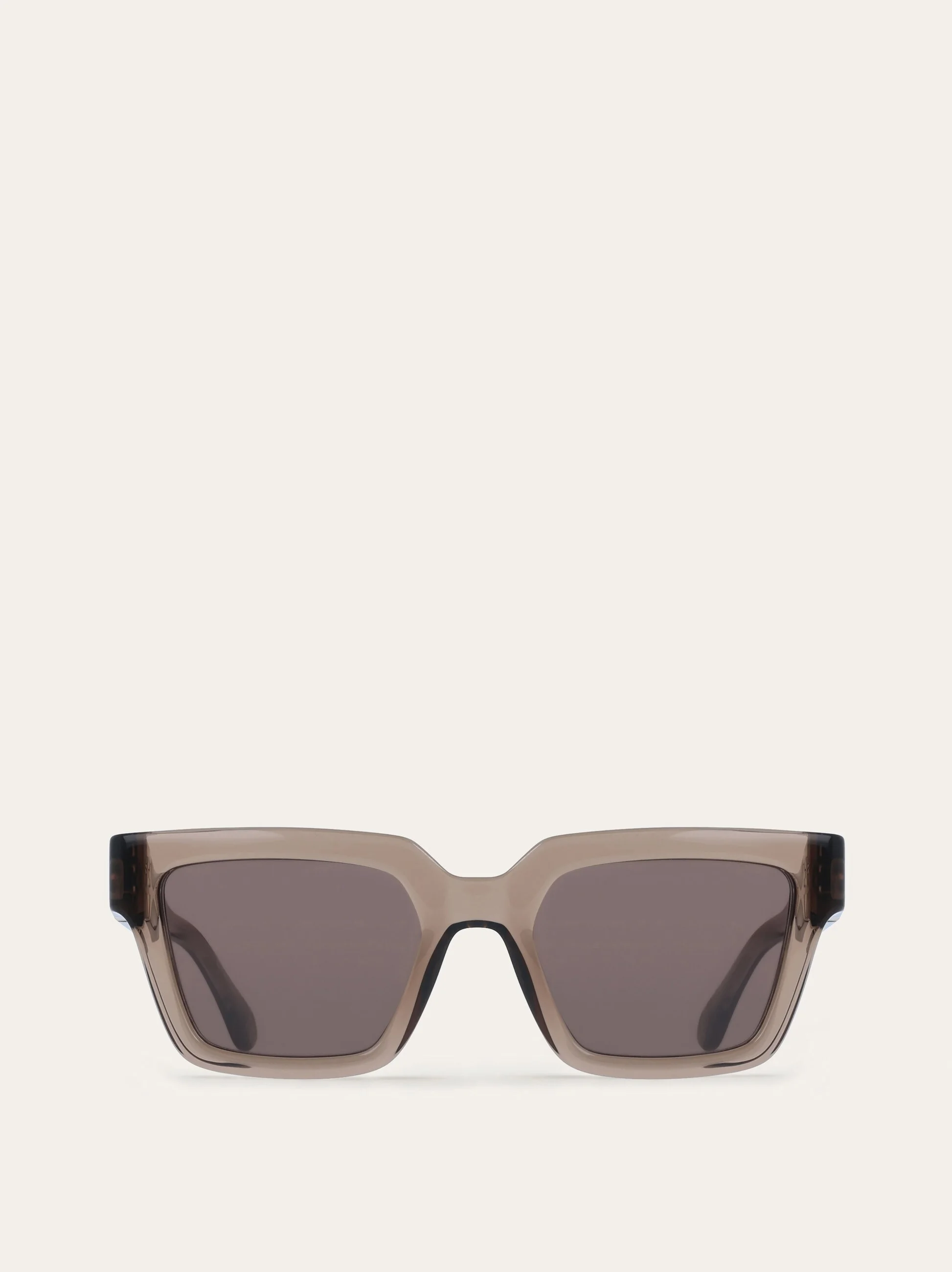 Women’s square-shaped acetate sunglasses characterized by bulky profiles. The Gancini ornament on the temples incorporates the hinge, thus becoming a functional element too. The temples reveal their metal core in the transparent colour versions. - Composition: acetate - Anti-UV and anti-scratch lenses - Global Fit. Lens-nose-temple size: 52-21-140 - Frame compatible with graduated lenses - Made in ITALY - Product code: 51H066 786640