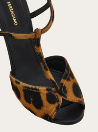 A classic silhouette revised in a modern key, this strappy sandal has all the sass of a 1920's flapper girl whose glamorous look is given an assertive twist via the luxurious leopard printed pony leather. The feminine silhouette features a T-bar strap that wraps the foot with a peep toe cut at the tip. With its curved edge, the stiletto heel adds an original twist to this ladylike shoe that fastens at the ankle via a golden Gancio buckle. - Composition: pony leather and calfskin - Made in ITALY - Product code: 01J842 781779