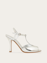 A classic silhouette revised in a modern key, this strappy sandal has all the sass of a 1920's flapper girl whose glamorous look is heightened by the metallic glow of laminated leather. The feminine silhouette features a T-bar strap that wraps the foot with a peep toe cut at the tip. With its curved edge, the stiletto heel adds an original twist to this ladylike shoe that fastens at the ankle via a golden Gancio buckle. - Composition: laminated leather - Made in ITALY - Product code: 01J838 781778