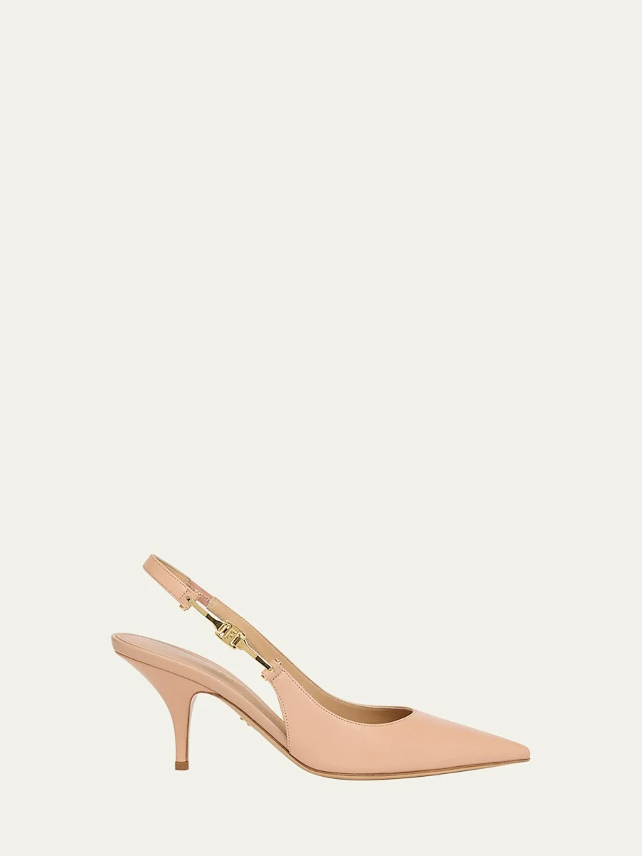 Ferragamo "Tally" smooth leather pumps featuring a logo-engraved metal strap accent 2.75 in / 70 mm stiletto heel Pointed toe Stretch slingback strap Leather/Rubber outsole Lining: Leather Professional cleaning recommended Made in Italy Online Inquiries: BGS21_X6USX| Store Inquiries: #4980288