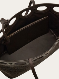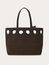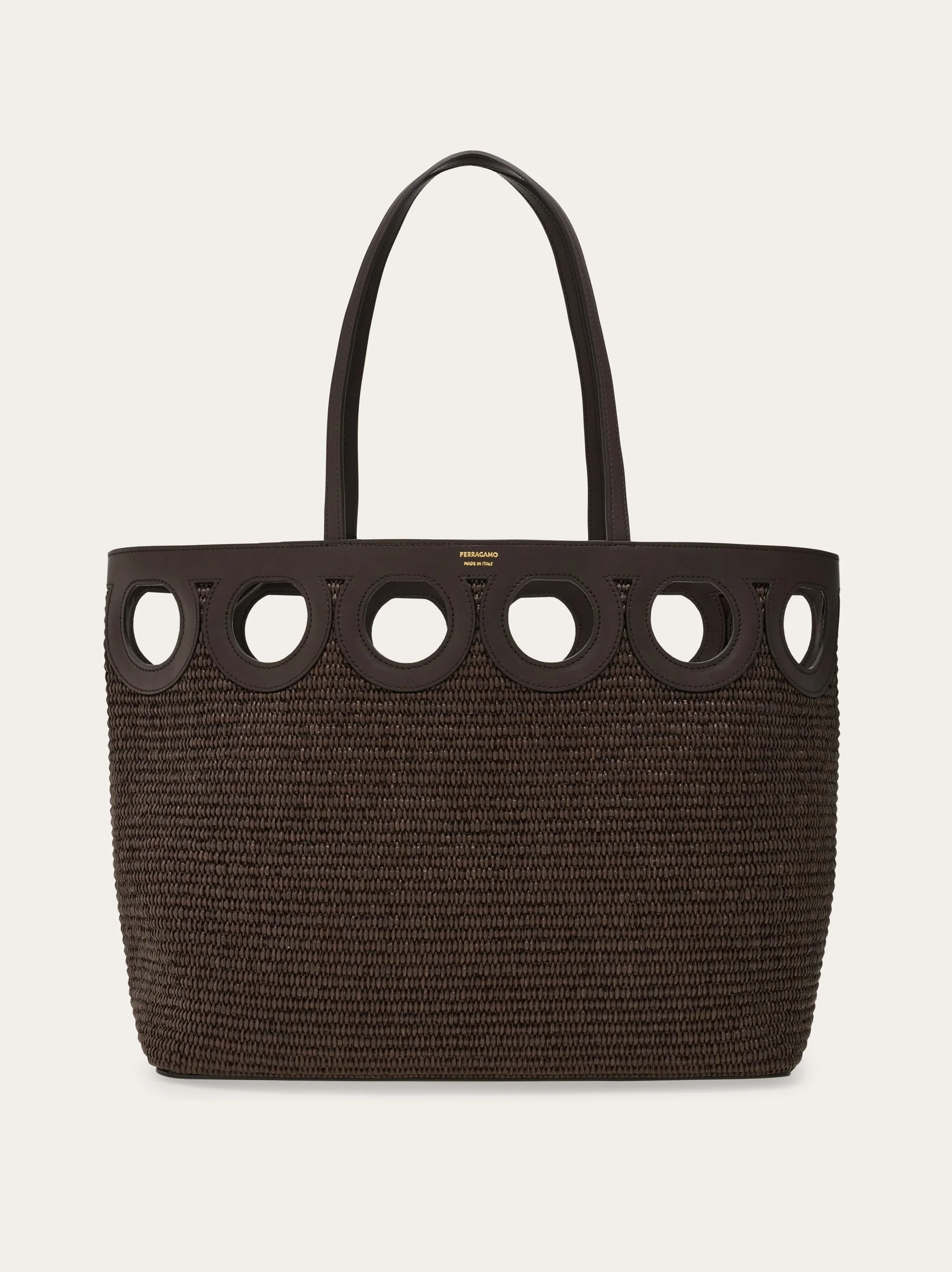 Unmistakably Ferragamo. Cut from calfskin leather, a row of Gancini silhouettes forms the trim of this unique raffia tote. Laid back style with an artisanal flair. - A) Height 11.0 IN B) Length 13.3 IN C) Width 5.5 IN - Composition: raffia and calfskin - Medium - Made in ITALY - Product code: 21A108 783828