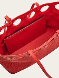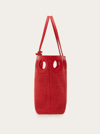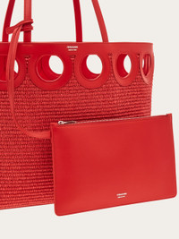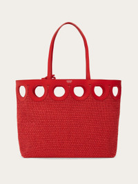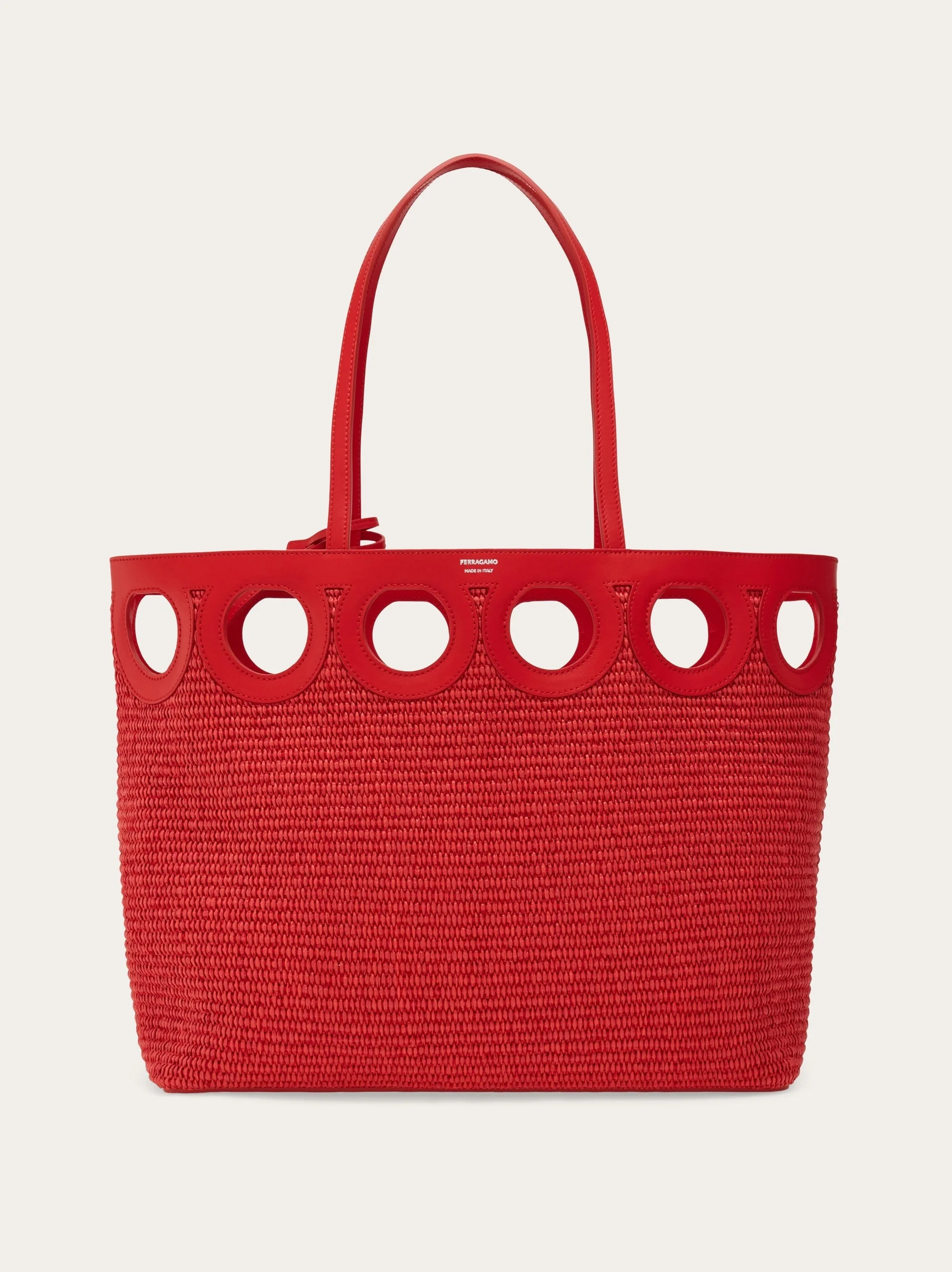 Unmistakably Ferragamo. Cut from calfskin leather, a row of Gancini silhouettes forms the trim of this unique raffia tote. Laid back style with an artisanal flair. - A) Height 11.0 IN B) Length 13.3 IN C) Width 5.5 IN - Composition: raffia and calfskin - Medium - Made in ITALY - Product code: 21A108 783827