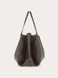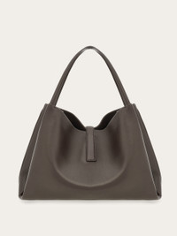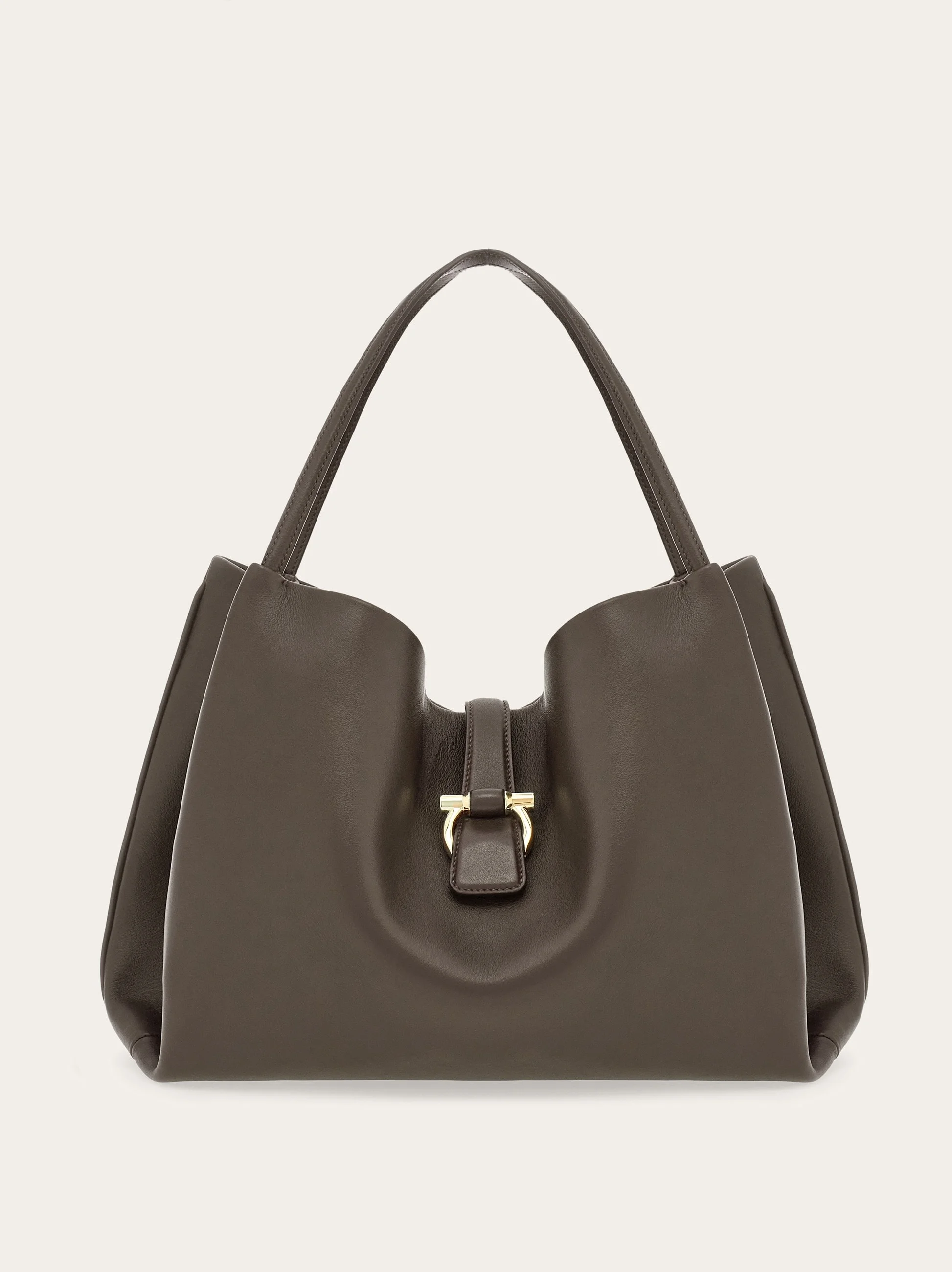 To have and to hold…A softened silhouette and rich materials confirm the iconic status of this new Ferragamo tote. Contemporary yet timeless, the sumptuous feel of calfskin leather is enhanced by the soft side bellows that evoke the shape of the lily, symbol of the city of Florence. A magnetic golden Gancini clasp fastens the top strap which opens to reveal a tonal lined interior with zip pocket. - A) Height 10.2 IN B) Length 14.9 IN C) Width 6.6 IN - Composition: calfskin - Large - Made in ITALY - Product code: 219804 785175