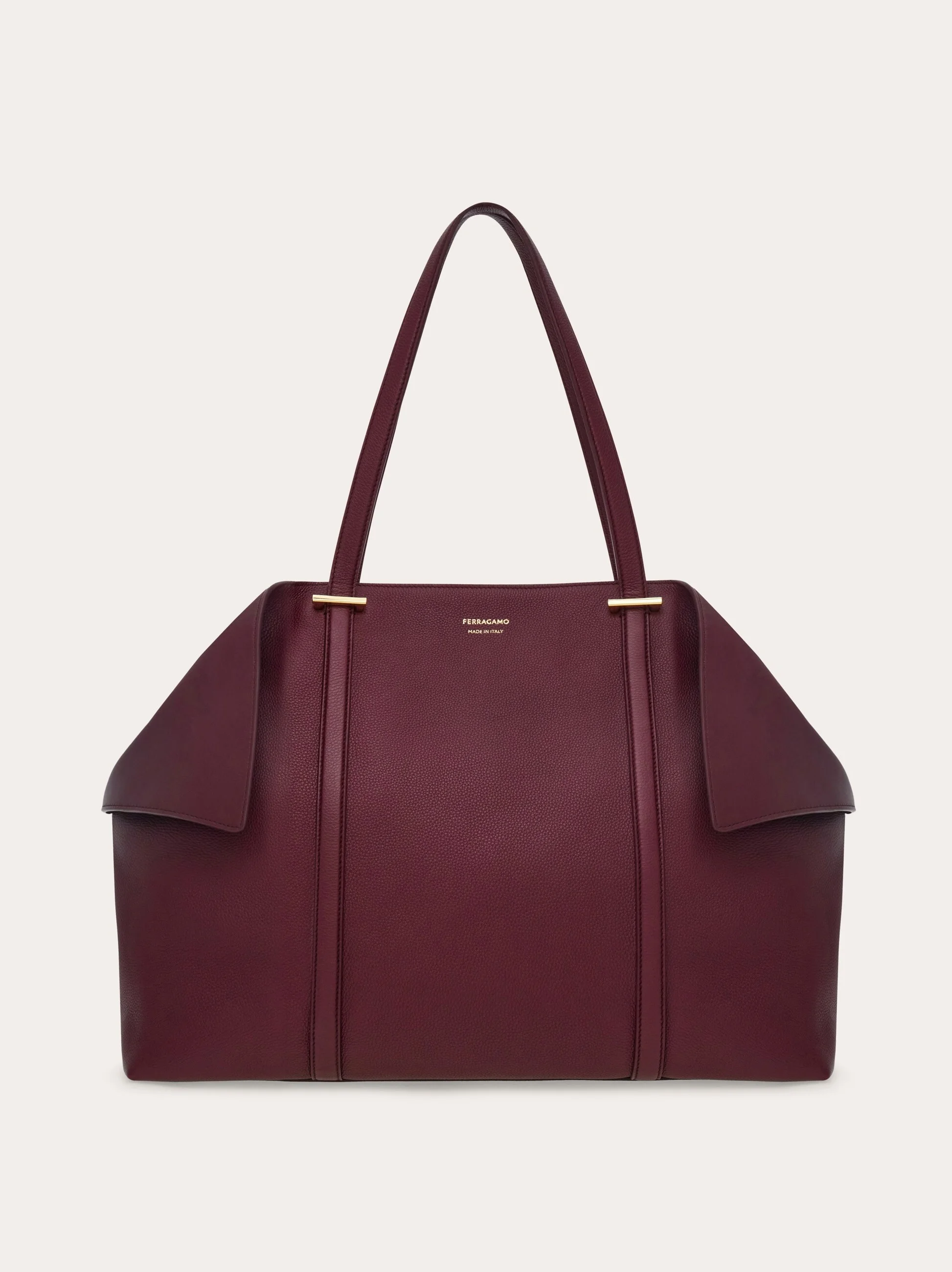 A distinguished edition of the Ferragamo tote, in delicious calfskin leather. The folded sides enhance the rich feel of the fabric, ideal to elevate everyday looks. The leather top handles extend along the front panels, punctuated by a simple rectangular golden clasp. A an embossed logo on the front panel completes the design of this ergonomic hold all that wraps the body perfectly as you move. - A) Height 11.8 IN B) Length 14.9 IN C) Width 7.0 IN - Composition: calfskin - Handle drop: 9.8 in/25 cm - Large - Made in ITALY - Product code: 21A452 789590