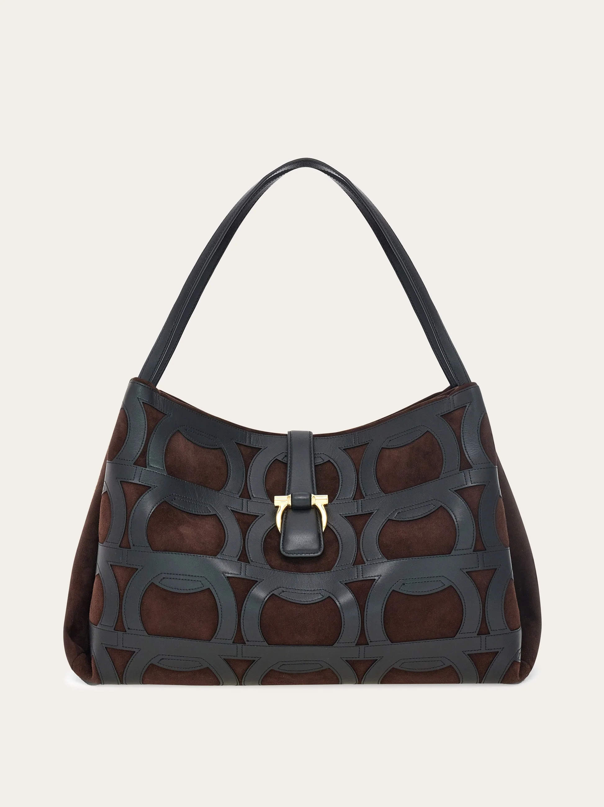 A sumptuously soft silhouette brought to life in rich textures, a beautiful iteration of the Ferragamo tote. The deconstructed line features gathered folds at the sides which echo the outline of the Florentine lily. Crafted from smooth suede, the dials are detailed with maxi leather Gancini overlays for a refined juxtaposition of textures. A Gancini buckle, symbol of its exquisite craftsmanship, completes the design, while the lined interior has a double compartment and a handy zip pocket. - A) Height 10.2 IN B) Length 14.9 IN C) Width 6.6 IN - Composition: calfskin leather and suede - Handle drop: 9.4 in/24 cm - Large - Made in ITALY - Product code: 21A252 786088