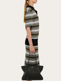 The classic tote, Ferragamo style. Cut from hammered calfskin leather with a rich, dappled texture, this much loved carry all folds slightly at the sides to create a new, original silhouette. This compact edition has a lined interior with a flat pocket, and a golden fob keyring hangs from the mid-length top handle. - A) Height 10.0 IN B) Length 13.7 IN C) Width 4.5 IN - Composition: hammered calfskin - Medium - Made in ITALY - Product code: 219861 779343