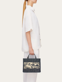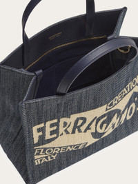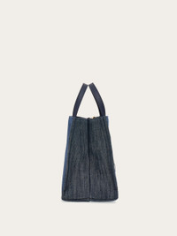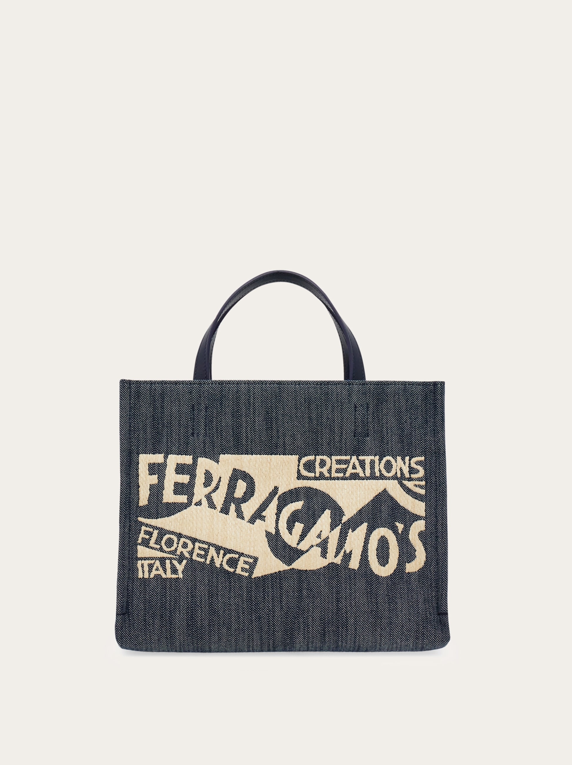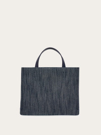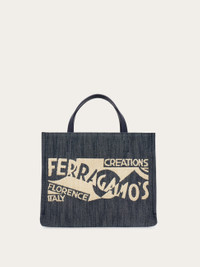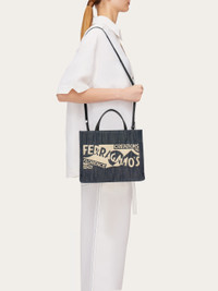 Summer days and nights never looked so stylish. Compact Ferragamo tote emblazoned with the iconic Venna logo, a futuristic interpretation of the Ferragamo signature created by the artist of the same name, and featuring on the Vara shoe since the 1930’s. The wash denim panels have leather handles and trims for a luxurious, practical note, echoed by the internal zip pocket and removable shoulder strap. - height 8.2 IN length 10.4 IN width 5.5 IN - Composition: denim and calfskin - Made in ITALY - Product code: 219407 773819