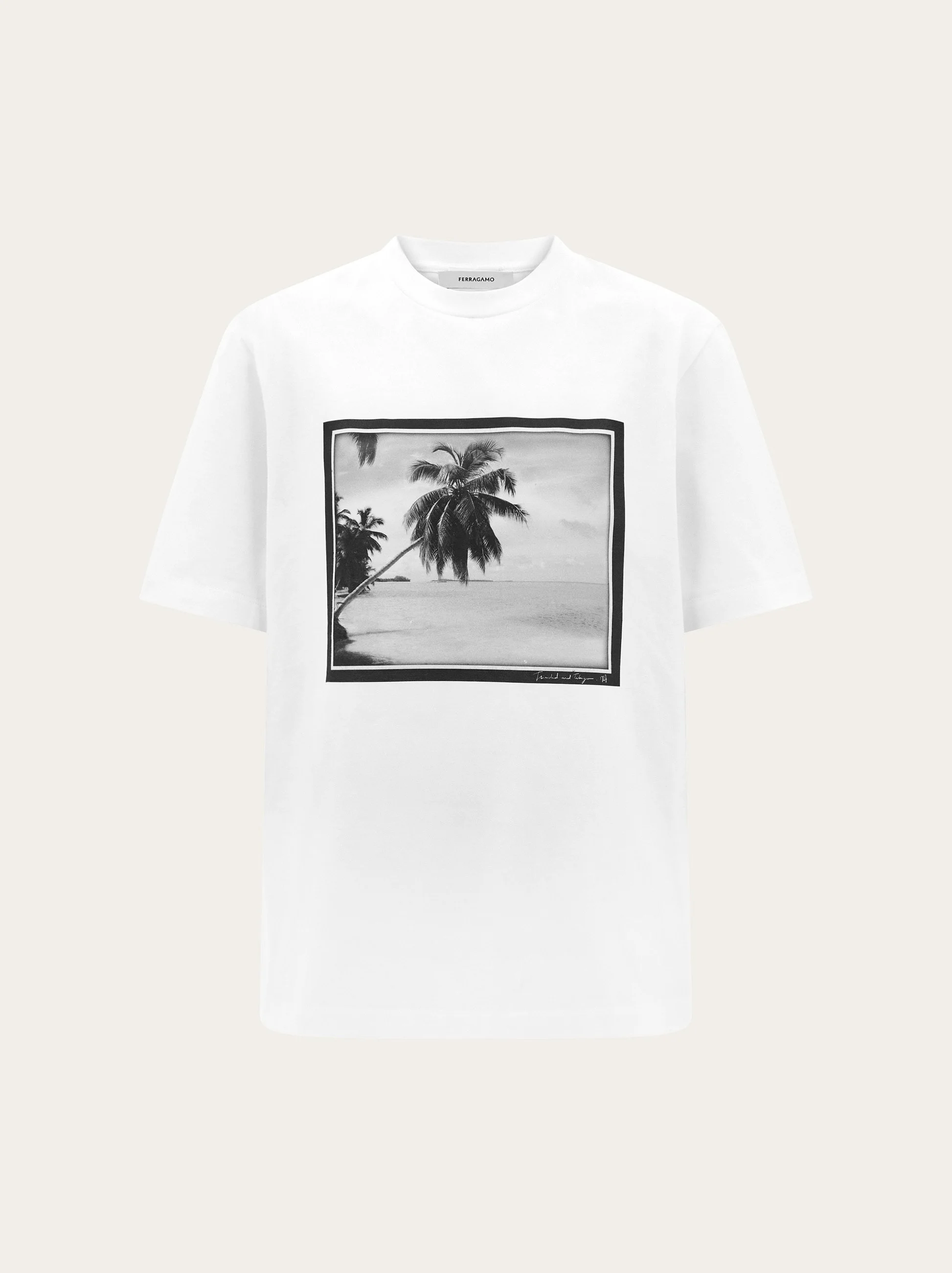 T-shirt in compact pure cotton jersey, with a feminine fit and ribbed neckline. The Trinidad print on the front evokes exotic postcards received in the middle of winter, completed by handwritten notes such as the Ferragamo signature on the edge. Small embroidered signature on the back of the neck. - Composition: 100% cotton - Made in ITALY - Product code: 13H785 788617