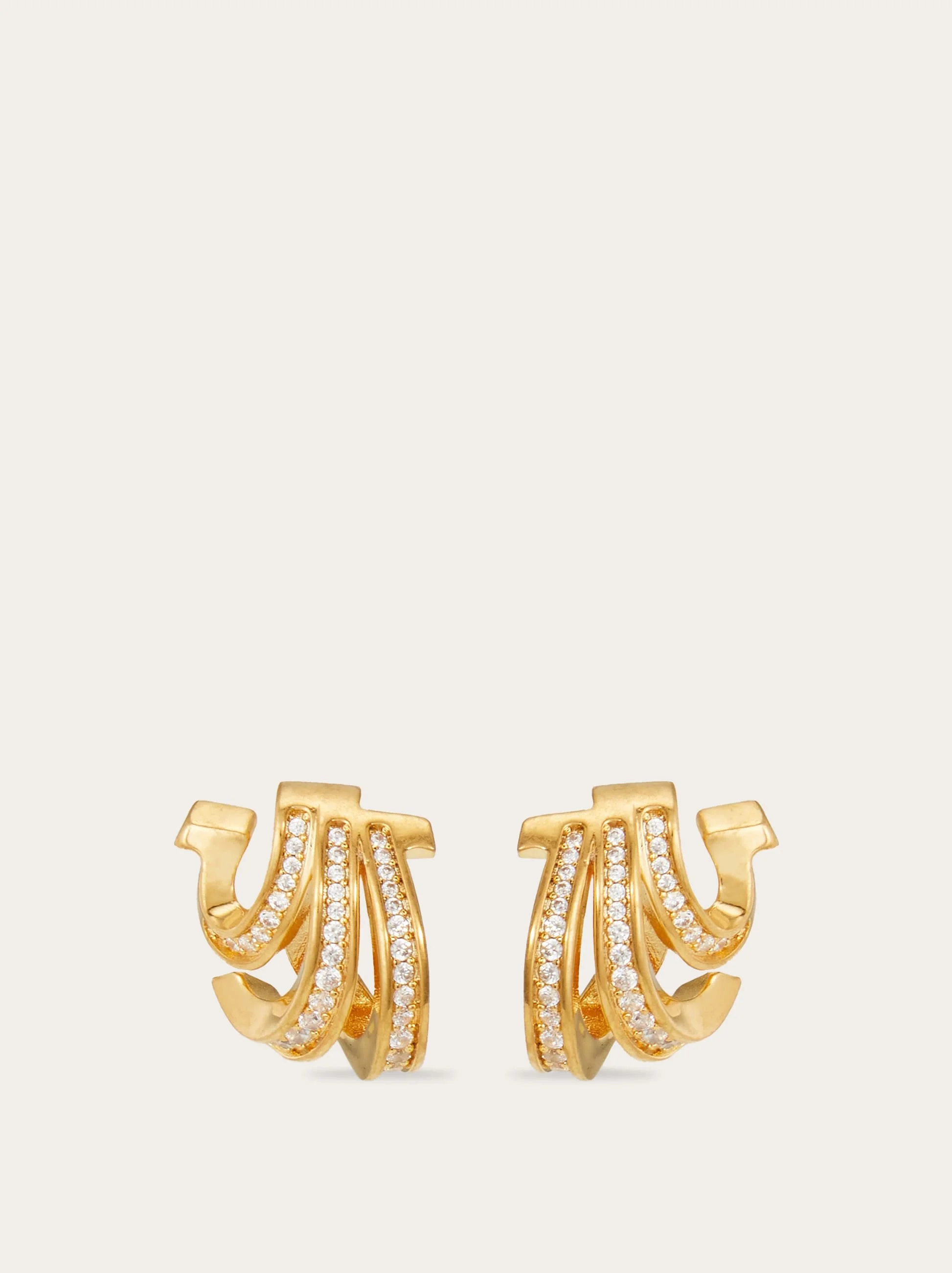 Statement hoop earrings reinterpreted with a triple Gancini design in graduated sizes, embellished with crystals. Finished in light gold with clip-on fastening. - Composition: 60% brass and 40% crystals - Made in ITALY - Product code: 760908 788171