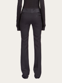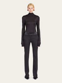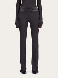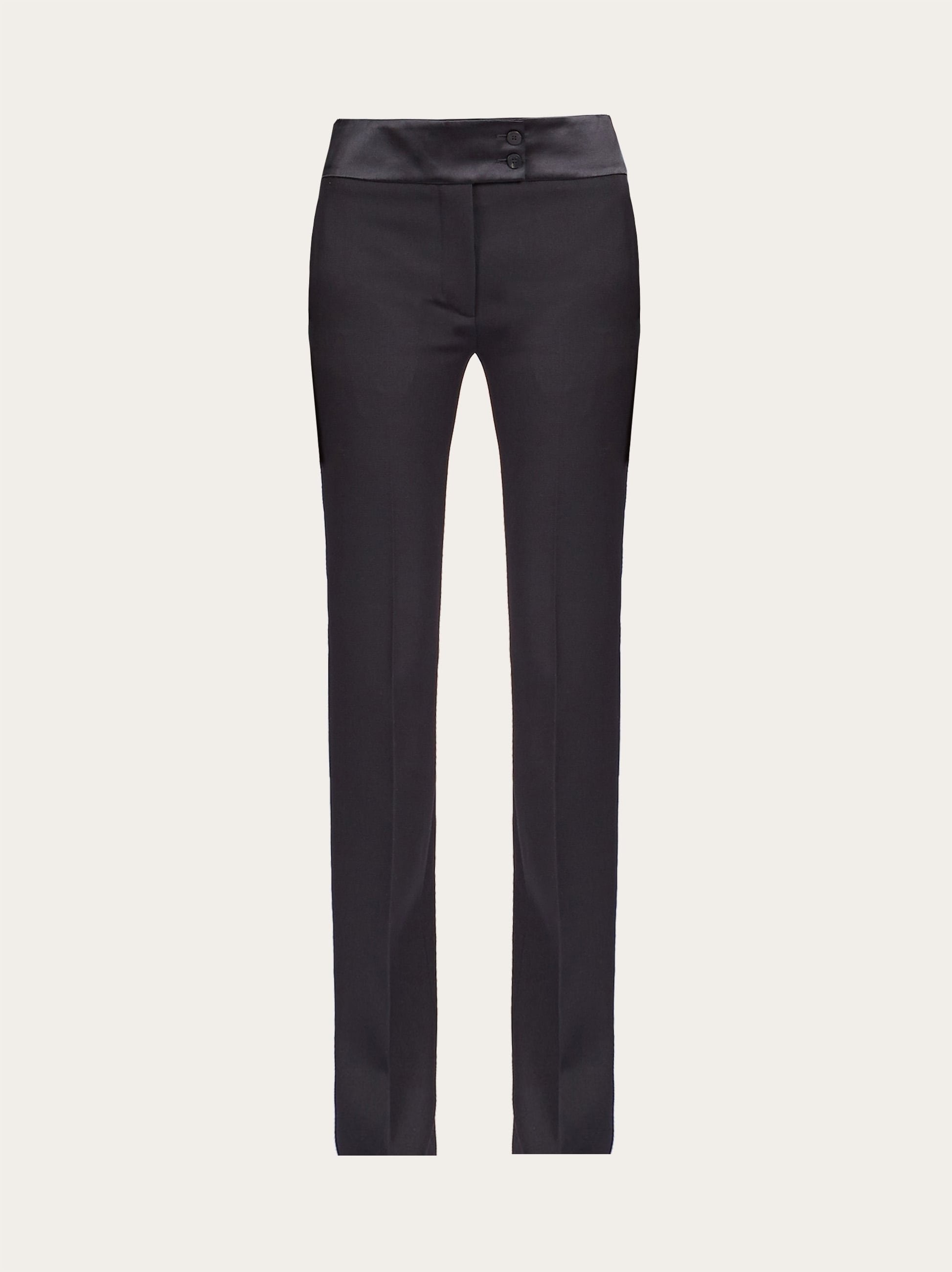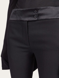 Straight leg tailored trouser with a sophisticated play of textures. The pure virgin wool features a wide, tonal satin belt and ironed crease along the front. Note the back pocket with double welt and diagonal pockets at the hips. Side fastening with hidden button. - Composition: 100% pure virgin wool - Model measurements: Height 5' 10"/178 cm; Bust 31½ "/80 cm; Waist 23½"/60 cm; Hips 34 "/88 cm - Model wearing: 38 - Made in ITALY - Product code: 13C879 770080