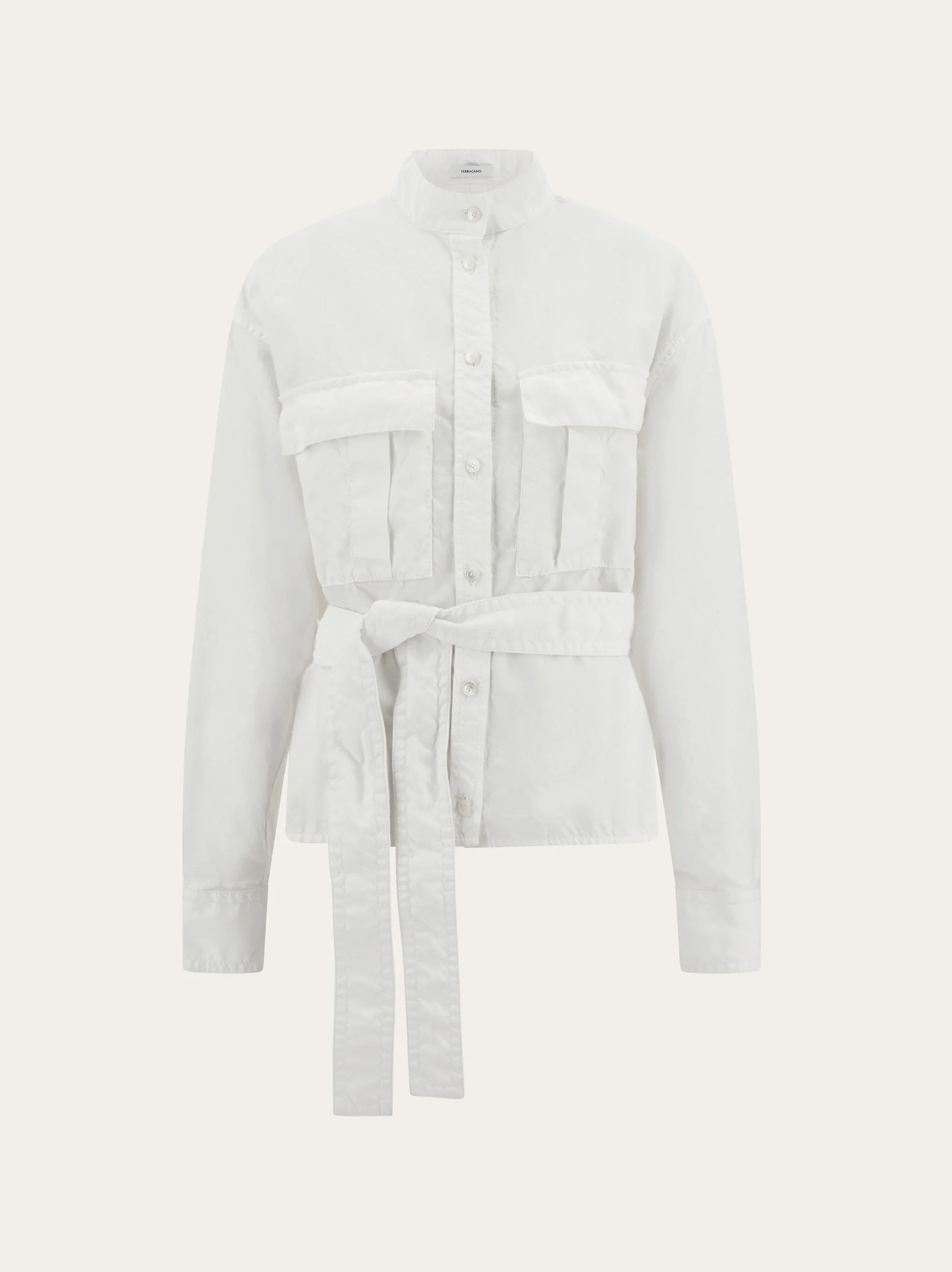 Utility style Saharan shirt cut from luminous cotton and viscose. The safari-inspired silhouette features large flap pockets on the chest, with a high neck and drop shoulder for a contemporary feel. A tonal sash cinches the volume at the waist. - Composition: 56% cotton, 44% viscose - Model measurements: Height 5' 10"/178 cm; Bust 32½ / 82cm; Waist 23½"/60 cm; Hips 34½"/87 cm - Model wearing: 38/XS - Made in ITALY - Product code: 13H270 783913