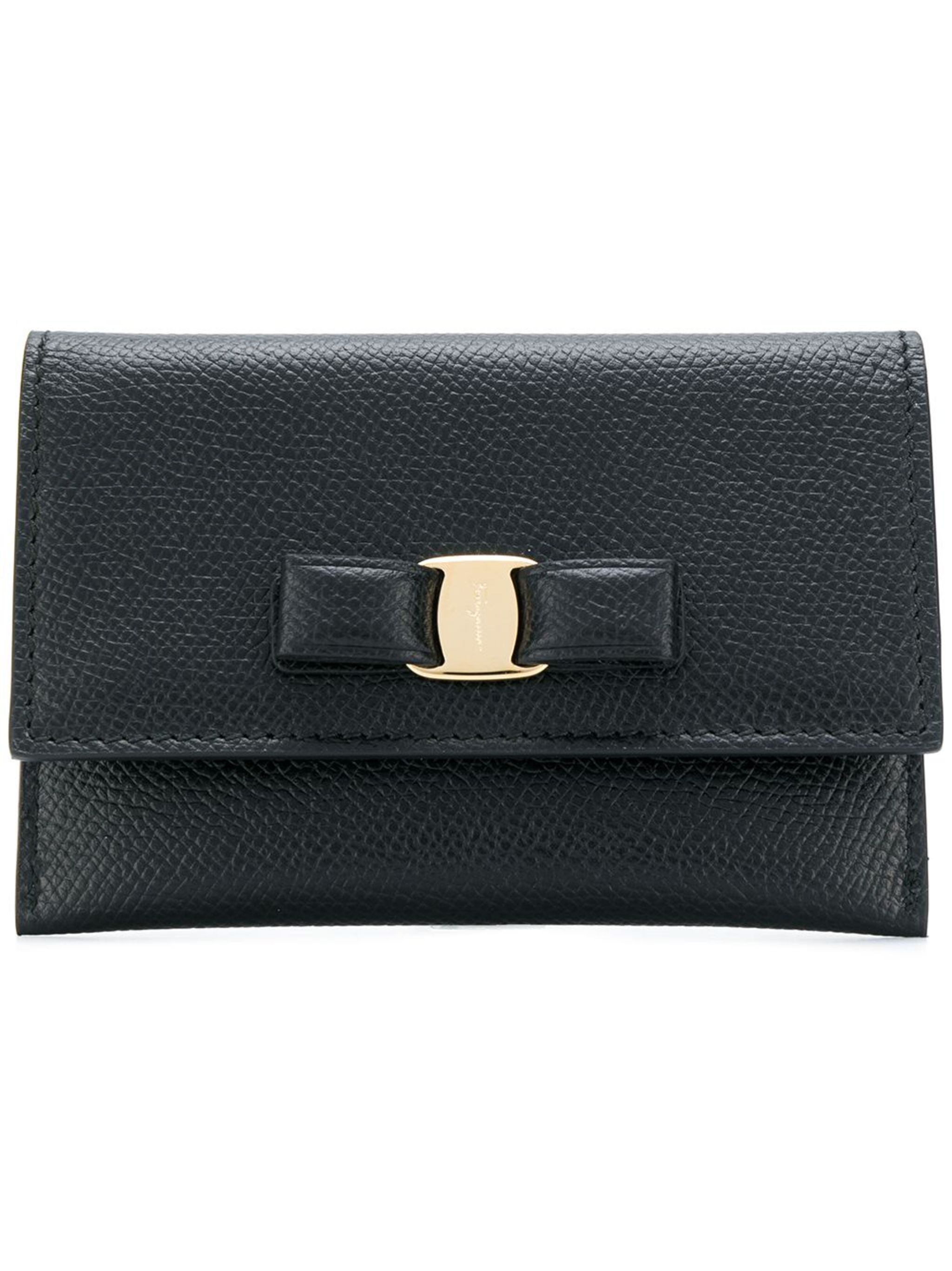 Vara bow-detail leather wallet from Ferragamo featuring jet black, calf leather, grained texture, foldover top with press-stud fastening, internal card slots and internal logo stamp. Size & Fit Model Measurements: Bust: 0cm Height: 0cm Hips: 0cm Waist: 0cm WIDTH: 11cm Length: 8cm Fabric and Care Designer Style ID: 683522 Designer Colour: BLACK Composition: Outer: Calfskin 100%; Lining: Fabric 30%, Calfskin 70%Made in Italy