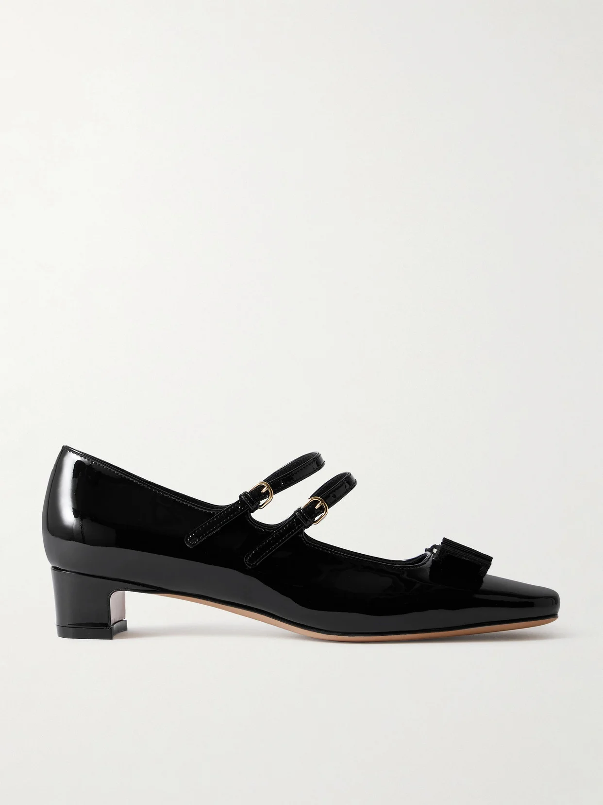 Ferragamo updates its signature 'Vara' pumps with double Mary Jane straps and a tonal grosgrain bow. They're crafted from glossy patent-leather and set on 30mm block heels. Large to size. See Size & Fit notes.