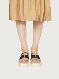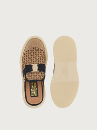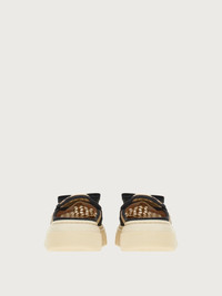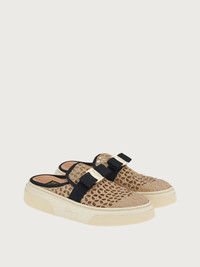 Athleisure becomes athluxury in this contemporary Ferragamo sneaker with iconic details. The macramé upper is adorned with a Vara bow in a contrasting grosgrain that is used for the trim, while the mule construction echoes a fashion feel. The ultra-light rubber sole features a raised Gancini, the stamp of exclusivity. - Heel 1 cm - Composition: fabric and calf leather - Made In ITALY