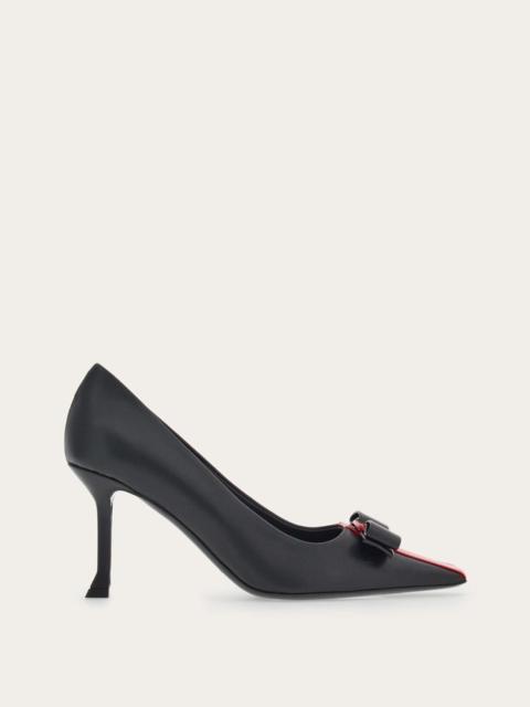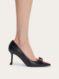 A contemporary tribute to the timeless pumps, this New Vara model features elongated lines and a tonal patent leather inlay on the nappa upper. The graphic details run across the toe and bow, adding shine and bold flair to the model. The geometric heel with flared base complements the design, adding an avant-garde edge. - Heel 8,5 cm - Composition: nappa and patent leather - Made In ITALY