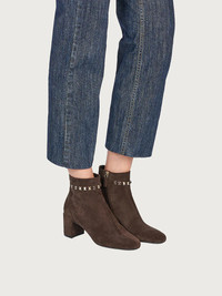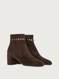 Keep it simple. The sleek lines of this chic little bootie make it versatile to pair with most winter looks. With its rounded toe, soft shapes and cupped heel that slims the silhouette, the 5.5cm is comfortable and sturdy for all-day style. This model is decorated with a Vara chain at the ankle, for a bright, iconic detail, perfect for metropolitan glamour. Internal zip at the ankle for a comfortable fit. - Heel 5,5 cm - Composition: calf leather - Made In ITALY
