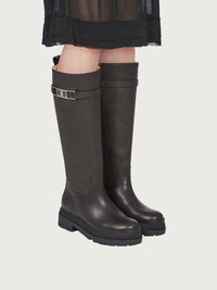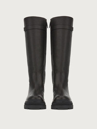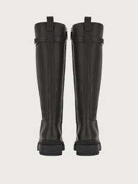 A chunky, low heeled boot with a luxurious feel, Ferragamo strikes the perfect balance between comfort and style with a touch of feminine grit. This cozy new take on the knee high boot has it lined with merino wool, while the upper is made of made of hydra leather, with a grainy deer print effect for a more casual touch. At the top of the leg proudly sits a Vara chain for instant recognition, while the lug sole is perfect for outdoor adventures or to add a modern twist to a girly look. - Heel 1,5 cm - Composition: hammered calf leather - Made In ITALY