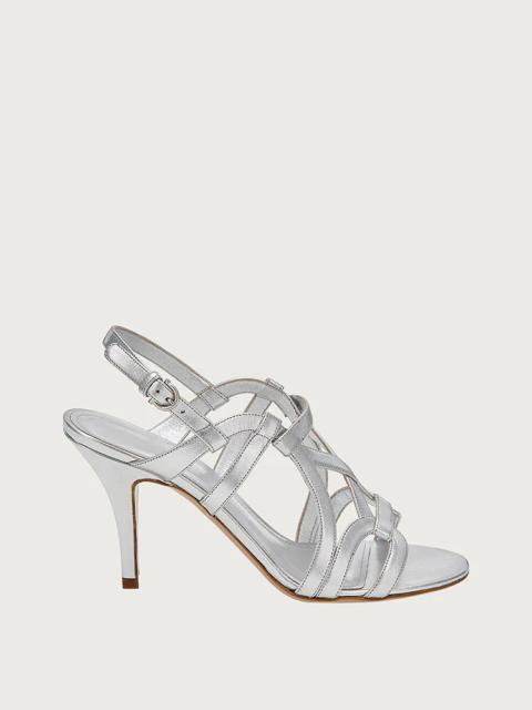 Slide your foot into this unmistakably Ferragamo sandal and enjoy the comfort of the chunky mid heel and wide straps. The straps are adorned with the iconic Vara in a golden chain, and the suede covered heel is an ideal 5.5cm in height. Minimal lines maximum style. - Heel 5,5 cm - Composition: Patent calf - Made In ITALY