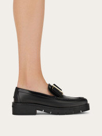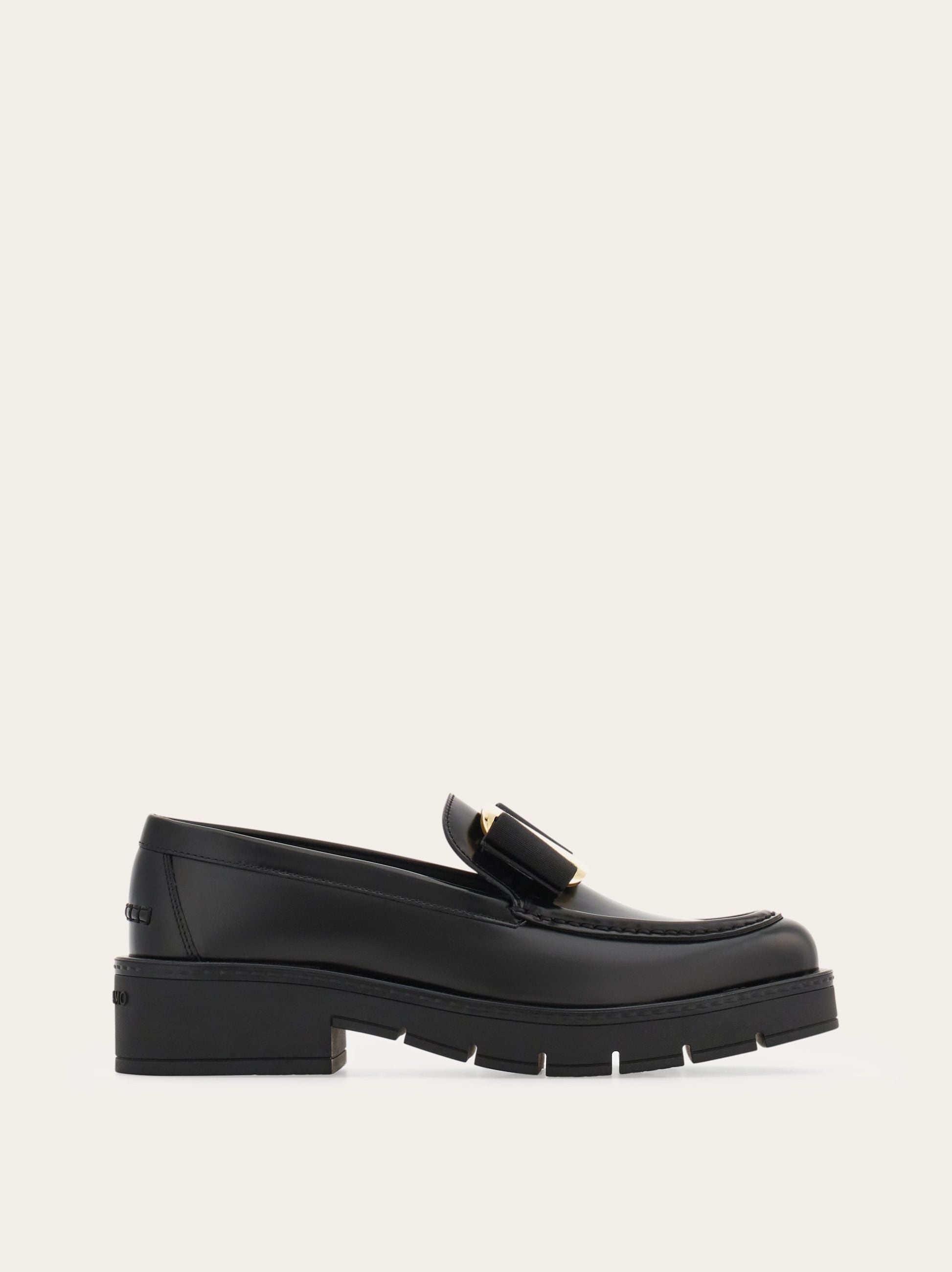 Edgy elements and feminine details come together harmoniously in this new take on the Ferragamo loafer. The buffed leather upper is graced by a gros grain Vara bow held by a custom golden buckle, and raised stitching around the vamp. Across the heel, raised stitching confirms the contemporary attitude echoed by the thick rubber sole with chunky custom tread, and deep grooves ensure a flexible fit. - Composition: buffed calfskin - Made in ITALY - Product code: 01J060 777353