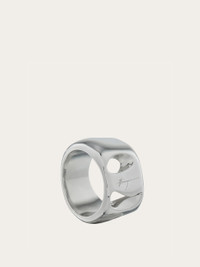 New band ring with organic lines and details inspired by the Vara buckle. Complemented by the engraved signature, it features a rhodium-plated finish that ensures radiance and durability with an anti-oxidation effect. - Composition: 100% silver - Size 54 - Made in ITALY - Product code: 780040 780761